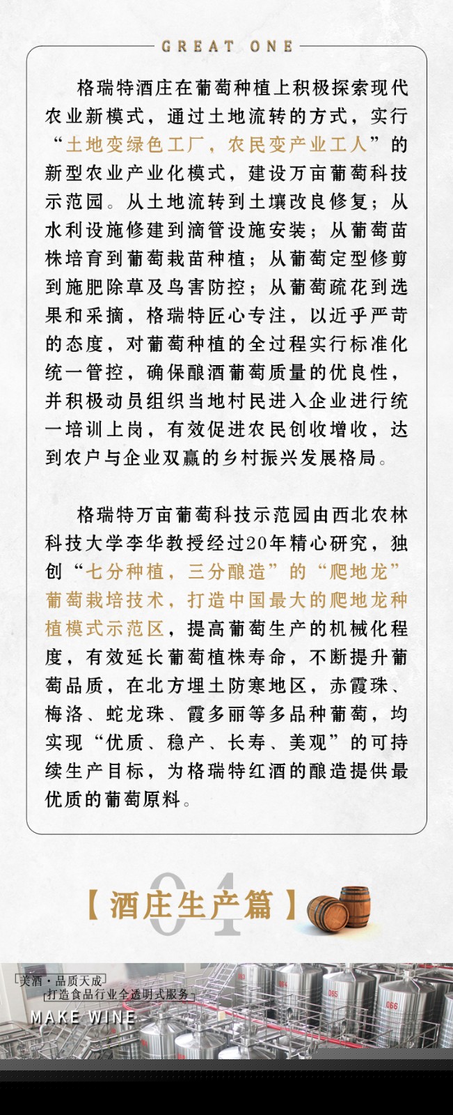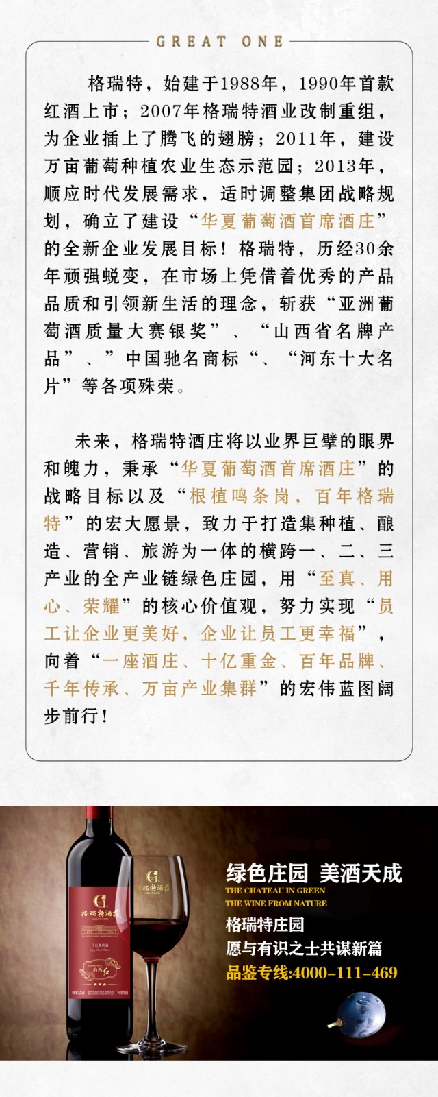 山西格瑞特酒莊有限公司成立于上世紀80年代,是一家集釀酒葡萄種植,釀酒生產(chǎn),農(nóng)業(yè)產(chǎn)業(yè)化,工業(yè)旅游化為一體